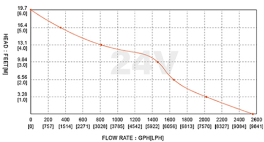 A Bomba de Porão 3000 GPH 24V opera com a vazão de 3000 GPH ou 11356 L/h, sua capacidade de elevação pode atingir a 6,0 m porem a vazão altera conforme a altura de elevação aumenta.