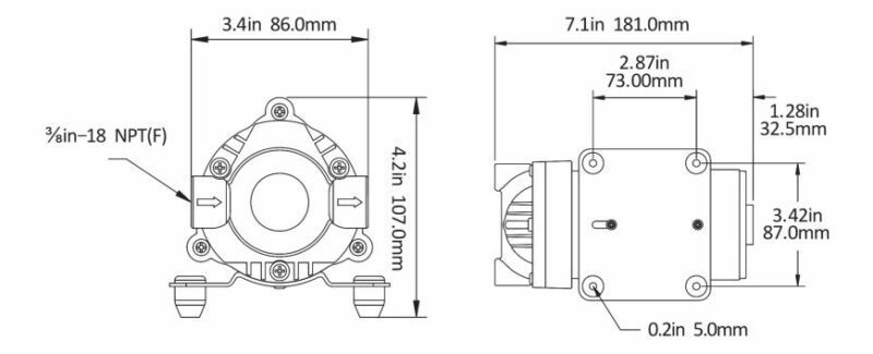 Voltagem: 220V Fluxo aberto: 1,5-1,8 GPM / 5,5-7,0 LPM Pressão de fechamento: 120 PSI / 8,3 BAR Capacidades de escorva: elevador de sucção de 6 pés (1,8 m) Temperatura máxima recomendada: 140° F (60° C) Máx. Material: Viton (válvulas) / Santoprene (diafragma) Portas: 3/8″-18 FNPT Cenários de aplicação: purificação e consumo de água.