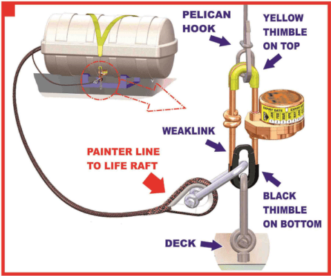 O sistema é estipulado quando a embarcação começa a submergir e é ativada antes que a embarcação atinja 4 metros de profundidade embaixo d’água. Uma vez que a unidade é ativada, ela corta o elo entre a embarcação e a balsa salva-vidas e libera a embarcação salva-vidas.